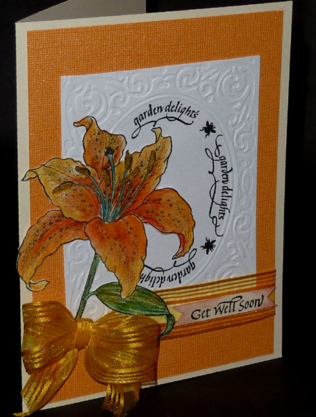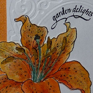 I stamped my Garden Delights oval with Versafine Black Onyx, then embossed it with the Cuttlebug folder from "The Heritage" set. Trimmed it down and adhered it to a Bazzill pearlized textured cardstock. Stamped the Day Lily (Auntie Amy's) with the black on white cardstock, cut it out and colored with Derwent Inktense watercolors. Added some glue to the stamens and sprinkled with "Fun Flock". Adhered to background. Tied a big bright yellow gauze peg bow, strung my horizontal piece through the knot and adhered to background then adhered the background to the main cream toned card. Stamped the small sentiment with the black on the cream cardstock, trimmed it down and punched the picots with a small square punch. Sponged some Distress red around the edges. Adhered to card with 3D foam tape. |