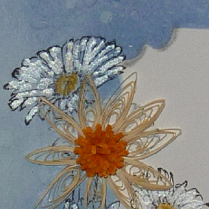 I used the Cuttlebug "Brocade Window" cut/emboss folder drop out piece from the previous card as a mask on this card, sponging Distress Shaded Lilac all around, adding water droplets and heat setting. Stamped the daisies (gg designs) with Versafine Black Onyx. Used Distress Stain Picket Fence to soften the stamped image where my quilling went. Used the Quilled Creations "Mums" die to make my fringe - love them, and 1/16" quilling paper for my petals. Shadowed the masked center area with a pencil and a blending stump. Wrote in my word "daisies" with a Nikko G pointed pen nib and Moon Palace Sumi ink, then shadowed the letters with a yellow colored pencil, then an HB pencil and a blending stump. Painted the flowers that weren't quilled with acrylic paint "Pearl White". Added the leaf left over from the previous card. Embossed the edge with Cuttlebug Lacey Labels" folder and a rubber mallet. Added amber rhinestones to the centers of the embossed flowers. Stamped the sentiment with the black on pearlized quilling paper and created a faux bow adding a square rhinestone. Punched out the butterfly (Martha Stewart "Royal Butterfly") from some leftover decorated paper and added some rhinestones for the body. |