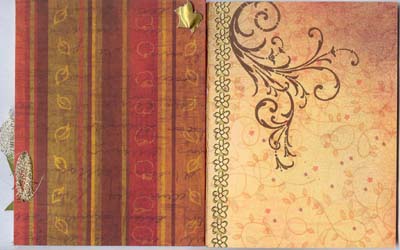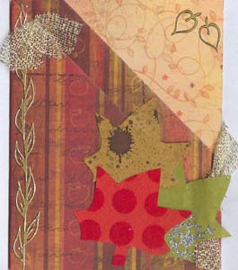 ID: Envelope Card We were given some pre made tags and we added the net ribbon, Magenta Peel Offs and the pre punched maple leaves. We rubber stamped inside, I used the flourish again. Can you tell I love that stamp. I didn't like the way the envelope folds kept opening so I punched some holes and used the net ribbon to keep things closed. |