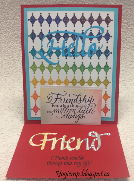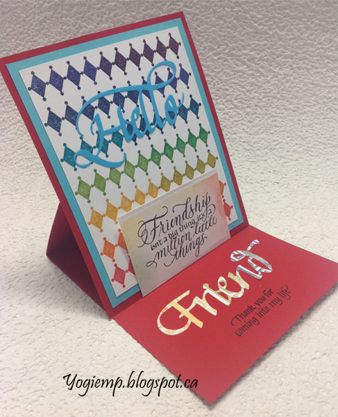 Created: August 11, 2017 I signed up for another of Jennifer Mcguire's onLine classes. Finally starting uploading my Day 2 cards... Love the harlequin background... I'm using an A Way With Words dies "Hello" and "Friends" (minus the "s') from Elizabeth Craft Designs, also available on Quietfire Design HERE and HERE And using a quote, sentiment and design element stamp from Quietfire Design, ("Friendship isn't a Big Thing..."); ("Some People Come Into Our Lives..." 2pce companion set); ("Dotted Harlequin Border" 2pce set)