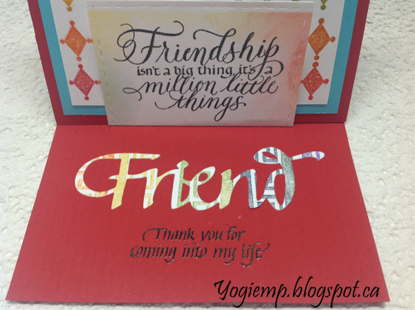 On the floor: Used the positive die cut of the word "Friends" (minus the "s") from a piece of the cut offs of a previous card you can see HERE. Stamped the sentiment with Versafine Black Onyx and clear embossed. Stamped the quote using Versafine Black Onyx and clear embossed on white cardstock. Die cut with Elizabeth Craft Designs "Stitched Rectangles" and sponged various colors around the edge. Scored a foot to the bottom of the die cut and adhered to floor to act as my stopper. |