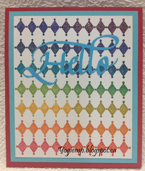 Used my Misti to stamp the Harlequin border (Quietfire Design) multiple times to create the background using Distress pads in rainbow colors, changing color tones on the same stamp line. Clear embossed sections as I went along. trimmed down and adhered to a deep blue cardstock and then onto my card front. Die cut the "Hello" from a mid toned blue cardstock and adhered to front. |