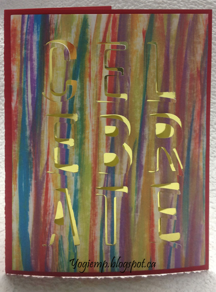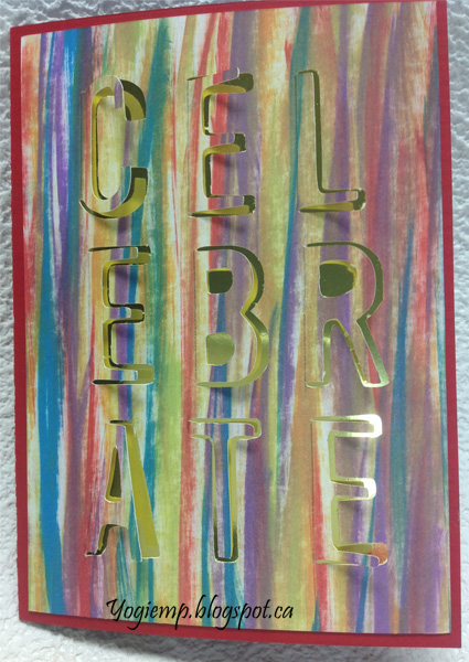 I worked on 110# Staples brand white cardstock, using the edge of my Oxide pad applied streaks of color using all the rainbow colors, filling in streaks where white cardstock still showed until it was totally covered. Trimmed down. Created fold out letters using my electronic cutter. Backed the openings with DoCraft gold Mirror cardstock (love this stuff...), then adhered to the front of the card. |