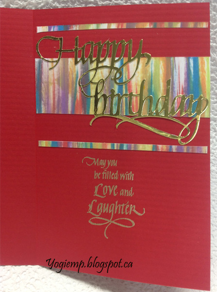 On the inside: Used scraps ends from my abstract piece and adhered to inside. Die cut the "Happy Birthday" from the gold mirror cardstock and adhered. Stamped the sentiment (minus the letter "r" and the word "home") using Versafine Toffee and embossed with Queen's Gold embossing powder |