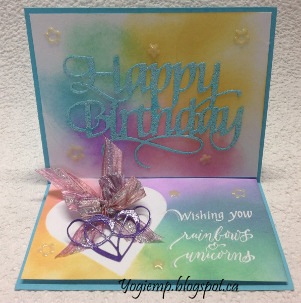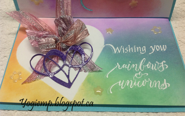 On the floor: Used another of the days blended techniques, this one was slightly different than taught... I used a mask of the heart shape instead of the stencil shape (Spellbinders "Hearts"), blending with the same colors as the front. Stamped the sentiment using Distress "Picket Fence" and embossing with white embossing powder. Tied a multi loop Sari ribbon bow ("Fairy" available at QuietfireDesign.ca) Die cut the flourished heart from a purple cardstock, inked with Versamark and clear embossed. Added more gel flowers. |