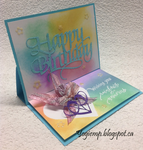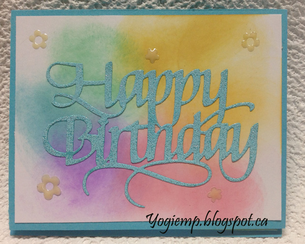 I worked on 110# Staples brand white cardstock, blending using a round sponge and Oxide pads (starting with Worn Lipstick, Spiced Marmalade, Fossilized Amber, Lucky Clover, Broken China, Wilted Violet) and working in a circle shape. Trimmed down. Adhered to front. Die cut the "Happy Birthday" from a blue cardstock, inked with Versamark and embossed with Emerald Creek "Turquoise Shimmer" embossing powder. Added a few gel flowers. |