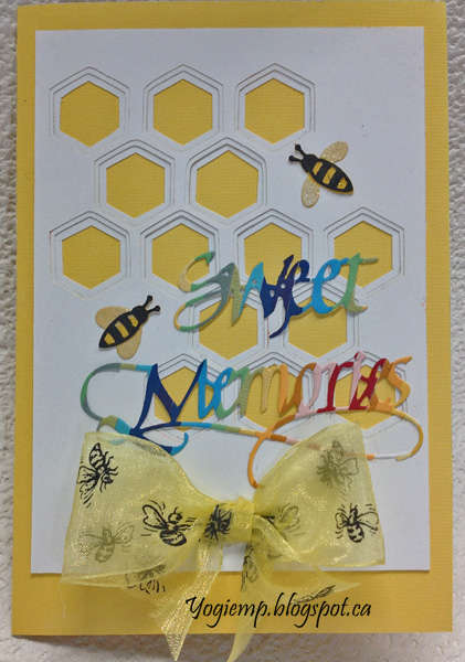 Cut and folded my yellow Bazzill monochromatic cardstock. Created a cut file to make my 3 layer bee hive background, cut from white cardstock. I slightly miscalculated... (senior moment), so the bottom layer I had to fussy cut... The sweet Memories is the positive die cut from the above background. Die cut the bees as above (Elizabeth Craft Designs) Tied the large bow using a yellow gauze bee stamped ribbon. |