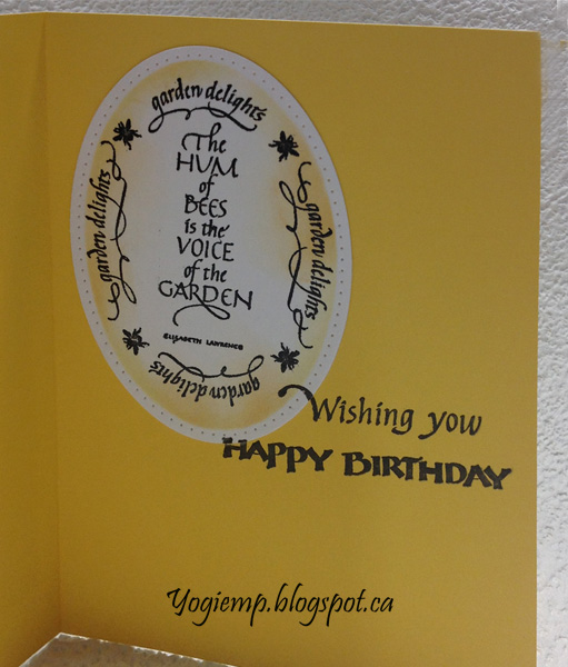 On the inside: Stamped the Garden delights decorative oval shape using Versafine Black Onyx and clear embossed. Stamped the quote suing the black and also clear embossed. Die cut using Elizabeth Craft Designs "Stitched Ovals" die set. Adhered to inside of card. Used my Misti to stamp the sentiment words using the black and clear embossed. |