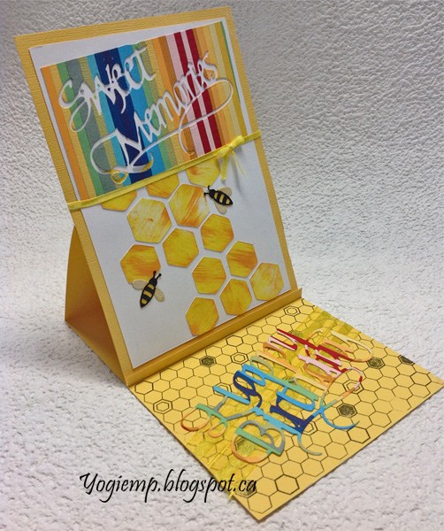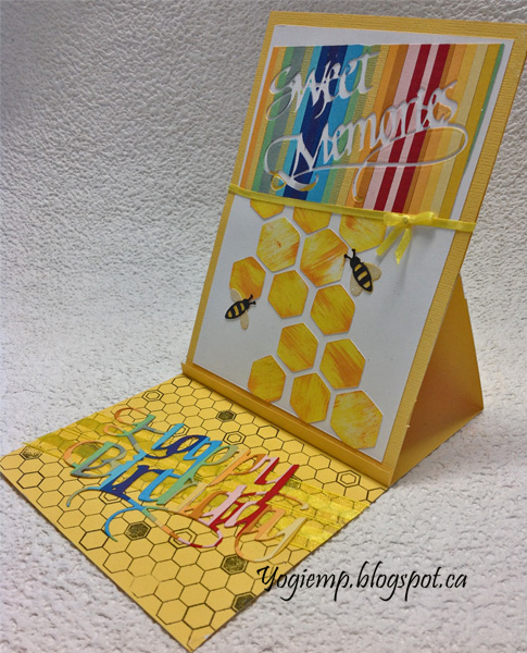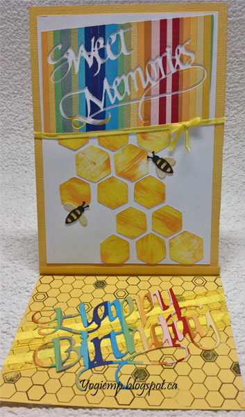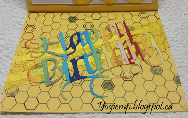 On the floor: Stamped the bee hive background (Local King Rubber) using the lack and clear embossed. Adhered 2 piece of a yellow gauze ribbon on the diagonal. Die cut the "Happy Birthday" from the background I created with the narrow stripes. Folded a narrow piece of the yellow cardstock to act as my footer. |