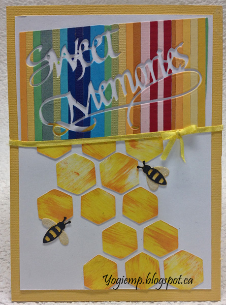 piece the same size for the front. The hexagon shapes are the backside of the cut file from the card below. I used Distress dabbers in "Mustard Seed" and "Spiced Marmalade" Arranged them in the same configuration as the cut file. One of the techniques in day 3 was creating a background of various striped widths of rainbow colored cardstocks, adhering them to a thin piece of cardstock to create a new background. I raided my thin strip drawer and proceeded to stick them to a 65# white cardstock using Ken Oliver's "Stick It". I then cut out the "Sweet Memories" words using the negative for this card. Adhered it to the bee hive background at an angle. Added a piece of narrow yellow ribbon and tied a small bow. Die cut the bees (Elizabeth Craft Designs) from a scrap of yellow cardstock, colored the body with a black Zig Writer. Assembled and adhered to front. |
