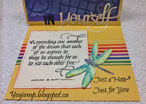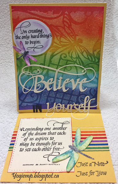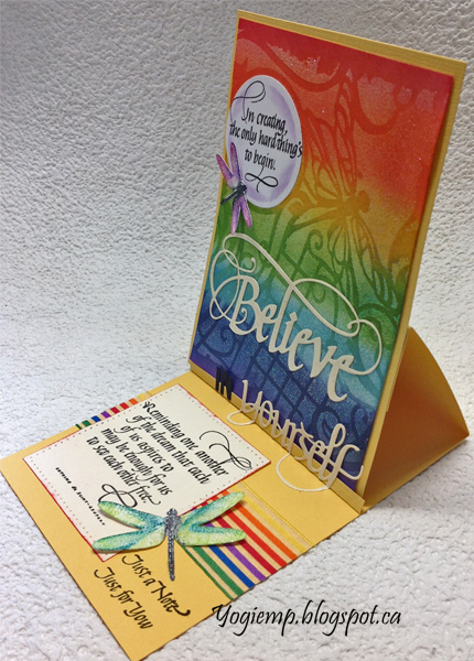 On the floor: Adhered a piece of rainbow ribbon to the floor. Stamped the quote on white cardstock using Versafine Black Onyx and clear embossed. Die cut with Elizabeth Craft Designs "Stitched Rectangles" hit the edges direct to paper with a red pad. Adhered to floor. Stamped the sentiments with the black using my Misti and clear embossed. Adhered one of the larger dragonflies. Die cut the letters for "IN" (Elizabeth Craft Designs) using black cardstock. Die cut the "yourself from cream cardstock and inked with the Versamark and clear embossed. Adhered both words to a strip of the yellow cardstock, then onto the floor to act as my stopper. |