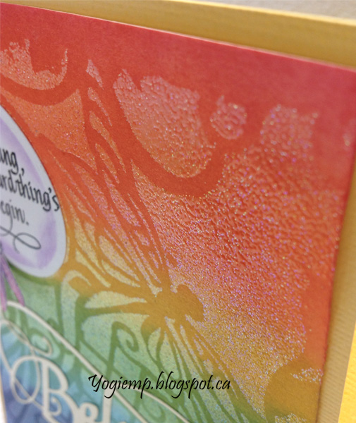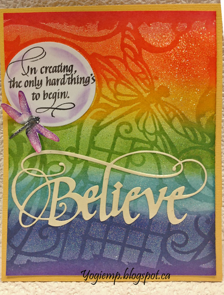 piece the same size for the front. Created the background on 90# Arches HP watercolor paper. Direct to paper and with a sponge using Distress pads in the rainbow colors. Generously misted with water and tilted the page to blend a bit. Dried thoroughly. Lay my Prima stencil onto the background. Mixed my Dreamweaver translucent paste with Distress Rock Candy glitter, then smeared it over the stencil. Removed stencil (washing it right away) and set the background aside to dry. Trimmed it down and adhered to front of card. Stamped the quote using Versafine Black Onyx and clear embossed. Die cut with Spellbinder's circle die set, sponged edges with a dirty purple sponge and adhered to card front. Die cut the "Believe" from cream cardstock, inked with Versamark and clear embossed. Adhered to front. Created a silhouette file to cut the dragonflies. Inked the stamp with Distress mini pads, stamping on the cut files (no fussy cutting...) and embossed with Emerald Creek "Iridescent Shimmer" |
