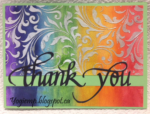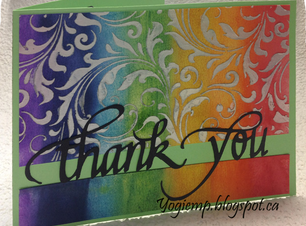card. Created the background on 90# HP Arches watercolor paper. Inked direct to paper and with a blending sponge. Misted with water generously and let the colors move around a bit. Dried thoroughly. Lay my stencil on top (Tim Holtz "Flourish) and applied Dreamweaver Pearlescent paste. Set aside to dry thoroughly. Since the stencil is narrower than my card front I trimmed it down and used the excess of the background on the bottom, leaving a space between the two pieces of the background. Die cut the "Thank You" from black cardstock ad adhered to front. Voila... |