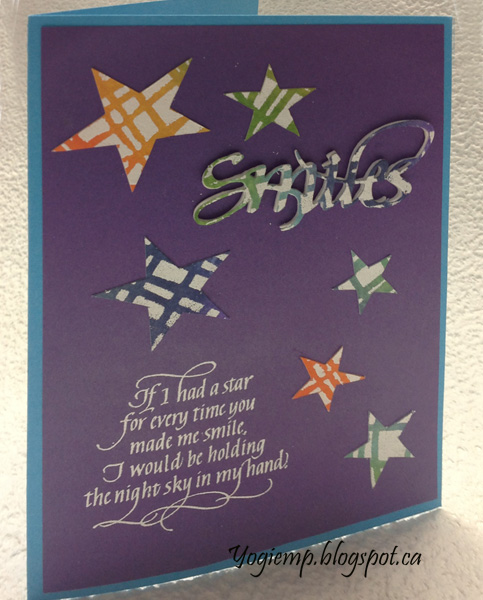 Created: August 15, 2017 I signed up for another of Jennifer Mcguire's onLine classes. Lots of Inspiration... I'll get around to doing something on the inside eventually... I'm using an A Way With Words dies "Smiles" from Elizabeth Craft Designs, also available on Quietfire Design HERE And using a quote stamp from Quietfire Design, ("If I Had A Star...")