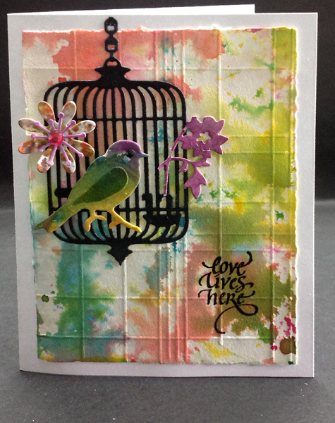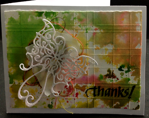 Background for both were done as one piece on Arches HP 90# watercolor paper and painted with artist quality watercolors. I first scored random lines using a scoring board. Both were trimmed down by tearing to keep a rough edge then adhered to side folded white card. Both sentiments were stamped with Versafine Black Onyx and clear embossed. Various die cut pieces from stash were added to the card above and rhinestones for the eye & center of the flower also added. Card at right had threads wrapped and adhered to card, then some torn tracing paper and then the glittered butterfly, all adhered with Glossy Accents. |
