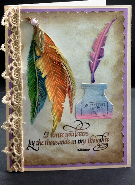 I painted two feathers on Arches HP 90# watercolor paper using artist quality watercolors and a micron pen as accents. The third (loose) feather and the inkwell were die cut from the striped background I created also on the Arches WC paper. Accented the feathers with a stylus and hit it with a Distress "Frayed Burlap" pad. The bottle I accented with the micron pen. Trimmed the paper down and used a deckle edged rotary cutter. Direct to paper with a Distress pad "Old Paper" and the edges with the frayed burlap sponge. Splattered with water to distress further. Adhered to a lavender cardstock. Stamped the quote with Versafine Black Onyx and clear embossed. Punched a hole and added the pearl brad that holds the feather charm which I colored with a Gold Leafing pen. Adhered these layers to my side folded cream card. Adhered the lace trim using a glue gun. |