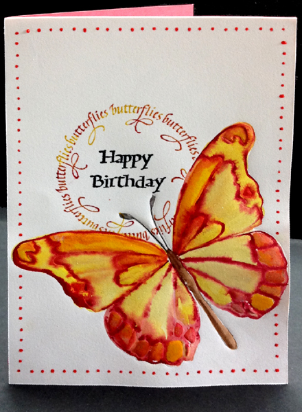 Embossed the butterfly (Memory Box "Flynn") into Arches 90# HP watercolor paper using a Spellbinders tan mat. you don't want to cut the image, just get a nice depth of embossing. Painted with artist quality watercolors and a wet brush. Dried it then wet each wing separately and used a fine tipped brush to outline the wing and details and allowed it to bleed. When dry, passed a Wink of Stella brush all over. Cut a mask of the butterfly then stamped the "Butterfly Circle" using Distress pads in "Mustard Seed" all over and hit here and there with "Fired Brick" & "Picked Raspberry", then clear embossed. Stamped the "Happy Birthday" with Versafine Black Onyx and clear embossed. Adhered edge to edge to a bright red side folded card, then added the red dots as a border using a Viva Pearl Pen in red. |