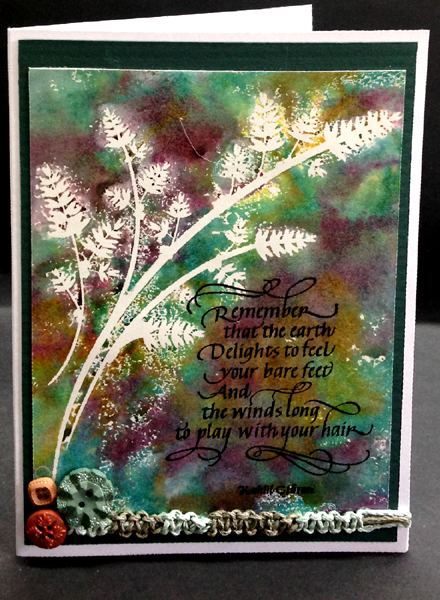 Both cards use the same technique of applying Distress pads directly on to a stencil, liberally misting with water and then pressing it down onto the watercolor paper, and using a paper towel to press the stencil down - which also picks up the excess color that seeps out of the openings. Lift stencil and dry. The card above uses Kaiser Craft "Wheat" the one at right uses Prima #569440, both done on Arches HP 90# watercolor paper and Distress pads. The card above was layered to a dark green textured cardstock, then on to a side folded white card. Quote stamped with Versafine Black Onyx and clear embossed. I macraméd the piece at the bottom with two shades of green twine, adhered to card with a glue gun and adhered 3 buttons. Card at right was off set on to a dark green cardstock on a side folded cream toned card. Colorful stitched ribbons adhered with a glue gun and then the buttons. Quote stamped with the black and clear embossed. |