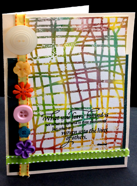 Created: May 16, 2014 This is the 11th day of the online watercolor for cards class. The card at left was the first one I did and then I had an urge to do the weaving one... One is serious and the other just fun. I'm using a quote stamp from Quietfire Design. Painted Stencil technique with Tim Holtz