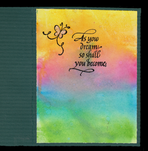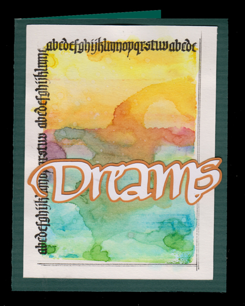 Stamped the alphabet border using Versafine Black Onyx repeatedly along the left and upper sides. Drew some thin black lines along the other two sides. Side folded my dark green card. Adhered the wc bkgr'd. eCut the word Dreams (Quietfire Design - Silhouette online store) from white cardstock, eCut a shadow layer from an orangey cardstock, Adhered the two layers together then onto the card. On the inside stamped the quote and butterfly flourish with the black and clear embossed. Added some glitter "Star Dust" on the butterfly using a Quickie Glue Pen. |