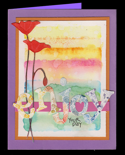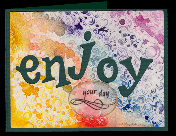 For this technique we used a large open type background stamp (Impression Obsession "Circle Swirls") on Canson 90# wc paper. I stamped using Versamark and clear embossed. Wet the paper and started applying my watercolors, merging the edges from one color to the next. Let dry. Used Sizzix "Fun Serif" lower case alphabet set and cut each letter individually. Adhered the background to my side folded dark green card. Stamped the words "your day" masking the stamp and stamping with versafine Black Onyx and clear embossing on drafting vellum. Die cut with Spellbinders oval set, edged with a Krylon gold leafing pen and adhered with Glossy Accents.