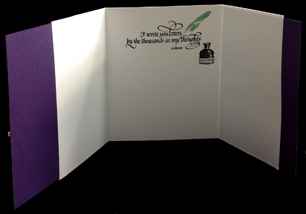 I taped down my watercolor paper onto an acrylic plate, brushed with water, then brushed with various watercolors, while still wet, lay down my stencil and then another acrylic plate and then under a heavy object. It takes a while to dry enough before you can heat dry it to finish the technique. I scored and folded my white cardstock to create a tri-fold card. Trimmed and layered my background onto purple cardstock then on to the front flap. Stamped the sentiment onto white cardstock using Versafine Black Onyx and clear embossed. Die cut with Spellbinders oval set, sponged some "Seedless Preserves" around the edges. Punched two holes and inserted purple toned eyelets. Strung my purple twine through the holes then adhered the oval to the card and the ends to the card using a glue gun. Added the flourish rhinestones. Repeated the same layer process on the inside flap and stamped the quote with the black and clear embossed. On the inside, stamped the quote and the inkwell with the black. for the quill pen, inked it with Distress markers (yellow & blue), misted with water and stamped. |
