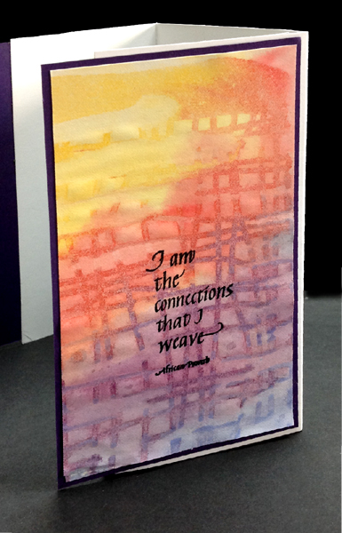 Created: May 6, 2014 On the first day I tried this technique without much success using Canson 90#CP watercolor paper & a Moroccan Tiles stencil by My favorite Things. The paper buckled even though it was under acrylic plates and the image didn't seep through like the sample. Sigh!! So I tried it again but this time I used Arches 90#HP watercolor paper and a Prima Stencil "of a weave pattern" - it work like a charm... Tried it again overnight and it worked again. BIG GRIN. I'm also using a sentiment stamp on the outside, and a couple quote stamps on the inside plus some image stamps from Quietfire Design Watercolor Wash with stencils technique with Jennifer Rzasa |