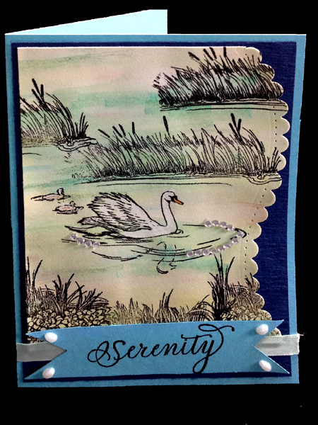 I used Derwent watercolor pencils (not Inktense) in yellow, blue, green & a touch of pink, then with my 1/2" brush wet the paper (Arches 90# HP) to blend colors. Dried. I die cut the edge using Spellbinders A2 Curved Borders One. Stamped the scenic elements (Flourishes "Swan Lake" #103) using Versafine Black Onyx, clear embossed. Adhered this to a dark blue Ruche cardstock, then on to my side folded aqua card. Stamped the "Serenity " with the black on a scrap piece of the aqua. Adhered a pale mint green ribbon across the bottom and then the sentiment which I cut a picot edge to both sides. Added oval white pearls on each corner. as a finishing touch added swirls of rhinestones in the water |
