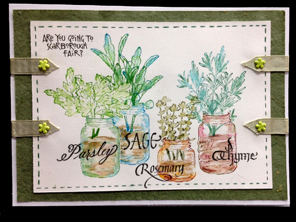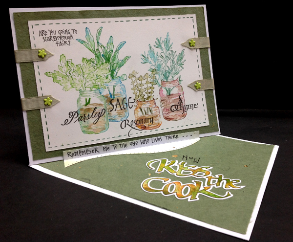 I stamped the various elements using Distress pads on arches 90# HP watercolor paper and then touching my watercolor brush to the inked image to gently move the color around. The foliage and herb words are from the "Parsley Sage... set" from Quietfire Design, the mason jar (Flourishes "Garden Picks"). I created masks from some tracing paper for the jars and the herbs so I could overlap things. Stamped the herb words with Versafine Black Onyx. Wrote in my words with a Micron pen and drew the stitching lines with a colored pencil. Adhered ribbon and attached brads to the ribbons on my watercolored edges Created my easel structure and adhered a piece of gold flecked green mulberry paper, then my watercolored design. Adhering the rest of the ribbon pieces to the back of the card. Wrote the rest of the quote on some scrap white cardstock then die cut with Spellbinders "A2 Curved Borders One" and adhered to floor which was covered with the green mulberry paper. This acted as my stopper. |