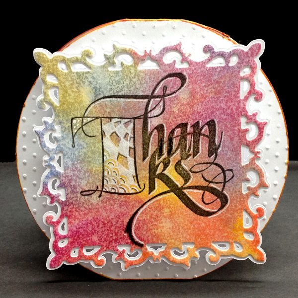 I applied various colors of art quality watercolors on a large 5 x 5" acrylic block using a 1/2" watercolor brush. Then misted with water, and pressed it down onto my Arches 90# HP watercolor paper and let the block sit while I went and made some cheese fondue (had a craving...). Was surprised when I came back 20 minutes later and the reaction my paints were having. I really liked the mottled effect Stamped the word wit Versafine Black Onyx and clear embossed. Used a pointed pen and a mix of Copic white and water to draw in the shadow lines around the words and do some doodling in the "T" area. Used a pencil to shadow some of the doodling. Die cut with Spellbinders Fleur de Lis square set (used the largest square) Created an eCut file to make a shadow layer of my Fleur de Lis piece from white cardstock and adhered the two together. Cut a top fold circle card using my EK Success circle scissor from white cardstock. Trimmed the bottom a touch so card stands... Ran through my embossing machine using the Cuttlebug "Swiss Dots" folder. Edged the circle with Distress pads "Picked Raspberry" & then again with "Mustard Seed". Adhered my text element with 3D tape. |