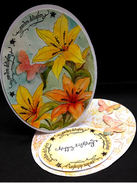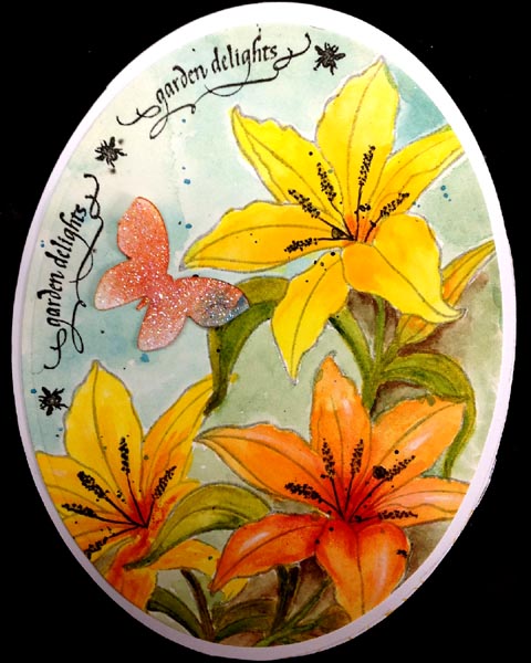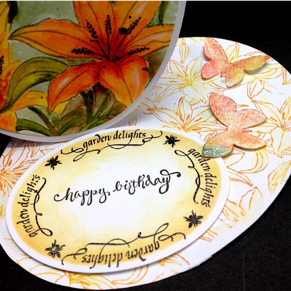 I stamped the lilies (Michael Strong) on Arches HP 90# watercolor paper using Versafine "Smokey Grey". I also created a mask to stamp the other lilies. I painted them with artist quality watercolors (mainly Winsor & Newton). Stamped the words "Garden Delights" using Versafine Black Onyx and a stamp positioner, stamping one word section at a time. Die cut my design using Spellbinders Grand ovals set, then used the outside edge to cut my under layer from white cardstock. Adhered the two together. Used the same die and hand cut my easel structure, then adhered my design element. Repeatedly stamped the background lilies (Michael Strong) using Distress pads on the floor. Used a wet brush to move some of the colors around. Stamped the Garden Delights on white cardstock with the black and clear embossed, then die cut with Spellbinders oval set. Stamped the newest "Happy Birthday" with the black and clear embossed. Adhered to floor with 3D foam tape to act as my stopper. I still had a bunch of these glittered butterflies I made a while back so adhered them to the front and floor of the card as well. |