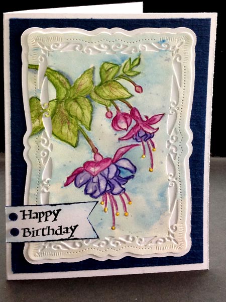 I stamped the fuchsias (Stampendous) on Arches HP 90# watercolor paper using Versafine "Smokey Grey". I painted them with Derwent Inktense watercolor pencils and a wet brush. Added yellow Stickles to the stamen. Die cut with Spellbinders "Radiant Rectangles" I used the die, scanned it and cut with my electronic cutter to get my shadow layer cut from white cardstock. Adhered a piece of dark blue Ruche cardstock to my card front leaving a white border all around, then adhered my design element. Stamped the "Happy Birthday" using Versafine Black Onyx and clear embossed. Hand cut and hit the edges with a dirty blue sponge. adhered to card front with 3D foam tape. Added the blue rhinestones. |