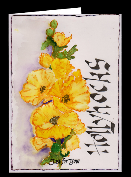 Image stamped (Stampendous "Jumbo Hollyhocks") on to Arches HP 90# watercolor paper using Distress pad "Dried Marigold". Then "Mustard Seed" and some artist green watercolors and lots of wetness. "Seedless Preserves" as shadow background. Stamped the text with Versafine Black Onyx. Wrote in my word "Hollyhocks" using a 6.0 parallel pen and Sumi ink in a funky lettering style. Trimmed the watercolor paper down by tearing it, then hitting the edges with the purple Distress pad and clear embossing. Adhered to a white side folded card. |