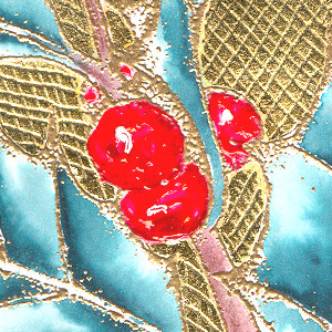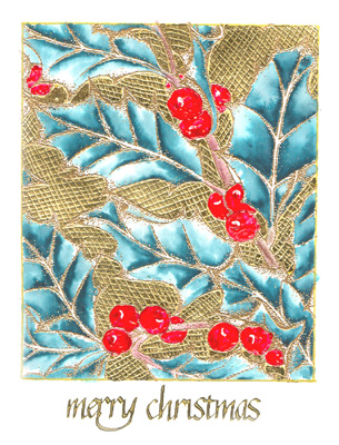I rubber stamped the background on white 110# cardstock with gold pigment ink and Queen's Gold embossing powder. Applied a border with Sanford Uniball Gold gel pen and used Jerry Tresser's size with my composition Gold leaf. Dry embossed my designs in the leaf. Used Sakura Stardust gel pens and moved the color around with a water brush. The berries were colored with red shiny 3D fabric paint and when dry a dot of white was added with Ranger's white Inkssentials pen. Added one of my calligraphic Peel Offs for the sentiment. |