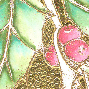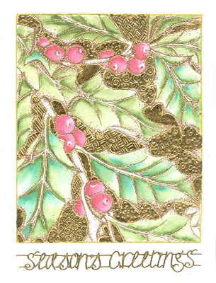I rubber stamped the background on white 110# cardstock with gold pigment ink and Queen's Gold embossing powder. Applied a border with Sanford Uniball Gold gel pen and used Jerry Tresser's size with my composition Gold leaf. Dry embossed my designs in the leaf. Used Sakura Stardust gel pens and moved the color around with a water brush. The berries, when dry added a dot of white with Ranger's white Inkssentials pen. Added one of my calligraphic Peel Offs for the sentiment. |
