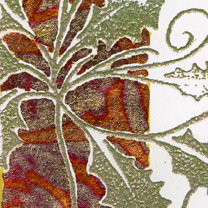 I rubber stamped the Holly Sprig on white 110# cardstock with green pigment ink and Magnolia embossing powder. Applied a border with Sanford Uniball Gold gel pen and used Jerry Tresser's size with my composition Red Variegated Gold leaf for the strip. Colored the background of the main card a bit with Pan Pastels. Added one of my calligraphic Peel Offs for the sentiment. |