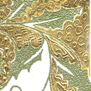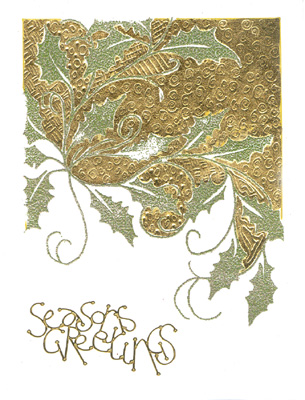 I rubber stamped the Holly Sprig on white 110# cardstock with green pigment ink and Magnolia embossing powder. Applied a border with Sanford Uniball Gold gel pen and used Jerry Tresser's size with my composition Gold leaf and then dry embossed the designs. Added one of my calligraphic Peel Offs for the sentiment. |