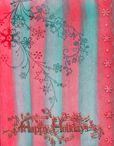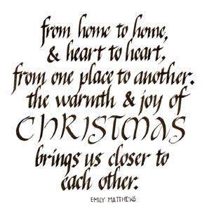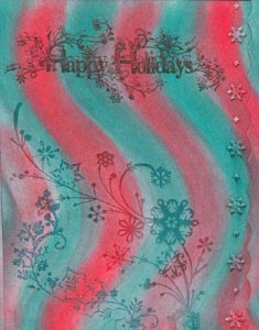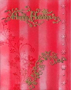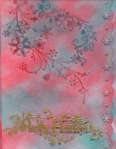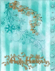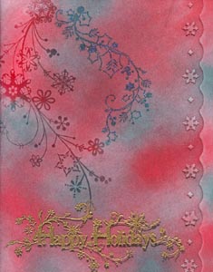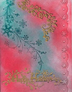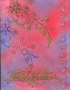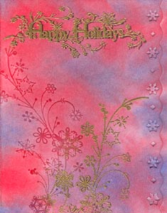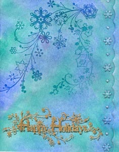 I'm making a bunch of Xmas cards again this year, but this time I'm doing them in batches of 10. Makes it easier to keep track of and I don't get as bored with repetitive designs. Most of the cards use my calligraphic Peel Offs which are available through Paper Pastimes here in Calgary, or on line with the Canadian Peel Offs representative under the name of Elizabeth Craft Designs. There are about a dozen word types available now with a couple more coming out in the new year. All these cards are done on white cardstock. They are 4.25w x 5.5h and are $4.00 each All the cards are punched out on one edge with a snowflake border punch which, when I'm using the Pan Pastels colors the border on the inside too. I used Inkadinkado Winter Trails #98394 clear rubber stamp set. They've all been stamped using the Ranger resist stamp pad, then colored with Pan Pastels, then usually stamped again with either Versafine or a Pigment stamp pad and thermal embossed with clear or gold or Holographic embossing powder. The "Happy Holidays" from the same set is stamped with Versafine Onyx black and then over stamped with a gold stamp pad and Queen's gold embossing powder to create a shadow effect. For the inside, I did a calligraphic quote with a 2.4 Parallel Pen and Moon Palace Sumi Ink, scanned it, then shrunk to size and printed it off onto white linen paper. |