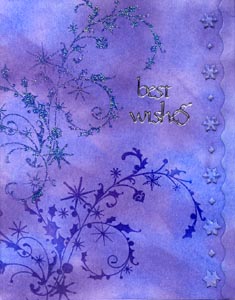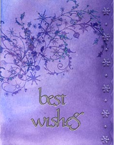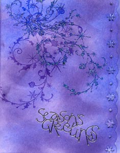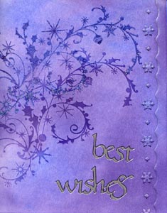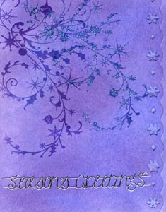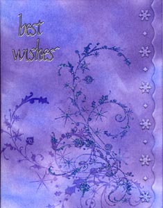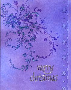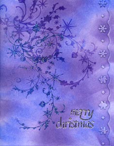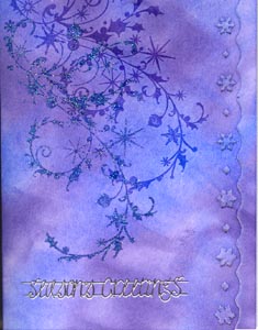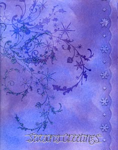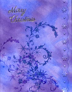 I'm making a bunch of Xmas cards again this year, but this time I'm doing them in batches of 10. Makes it easier to keep track of and I don't get as bored with repetitive designs. Most of the cards use my calligraphic Peel Offs which are available through Paper Pastimes here in Calgary, or on line with the Canadian Peel Offs representative under the name of Elizabeth Craft Designs. There are four colors of each (silver, gold, black & white) and about a dozen word types available now with a couple more coming out in the new year. All these cards are done on white cardstock. They are 4.25w x 5.5h and are $5.00 each All the cards are punched out on one edge with a snowflake border punch which, when I'm using the Pan Pastels colors the border on the inside too. I used Inkadinkado Winter Trails #98394 clear rubber stamp set. This is my favorite stamp from this set. They've all been stamped using the Ranger resist stamp pad, then colored with Pan Pastels (ultramarine blue & violet), then stamped again with a Pigment stamp pad and thermal embossed with Holographic embossing powder. For the inside, I did a calligraphic quote with a 2.4 Parallel Pen and Moon Palace Sumi Ink, scanned it, then shrunk to size and printed it off onto white linen paper. |