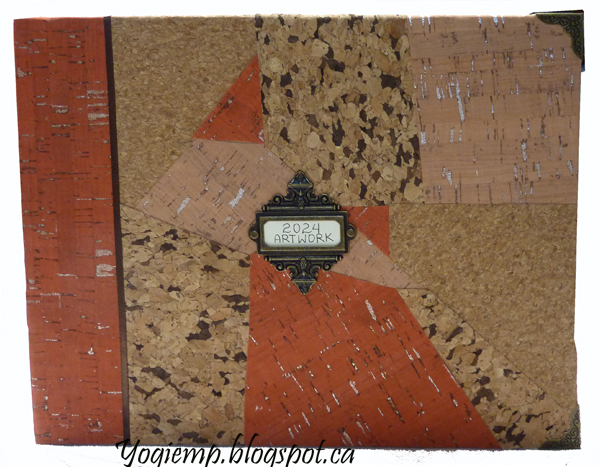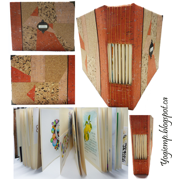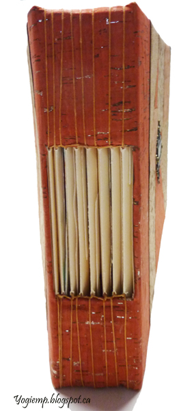 The covers were made from regular cardboard from boxes and covered with a collage of various designs of cork fabric. I wanted a thick cover and was too lazy to pull out my matte board or foam core. Inside of cover adhered a piece of the cream cardstock to keep it neat. Bound with butterscotch 4ply waxed linen thread in Buttonhole stitch. Added a metal ornament to hold the title on the cover and book corners to save those edges...