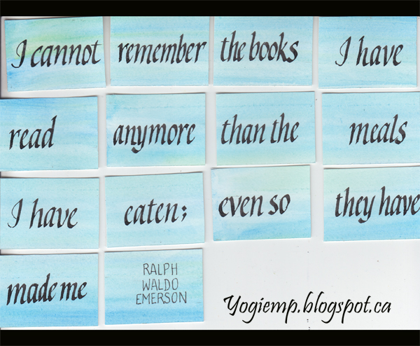 I used a scrap piece of Geli print I created a while back for the cover and Canson Colorline cardstock for the box with a piece of painted watercolor paper . Wrote out the quote on pieces of Master Craft H watercolor paper using a 2.4 Parallel pen and Sumi ink in an Italic style