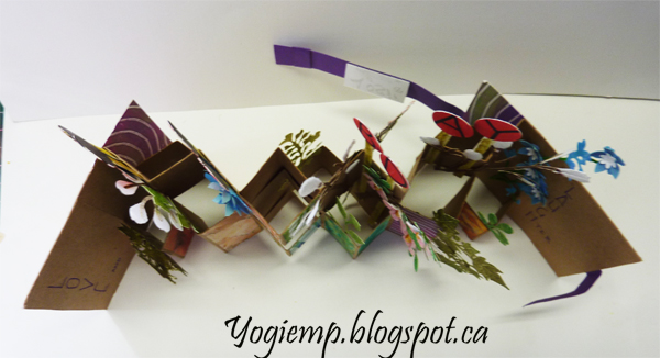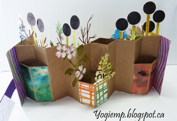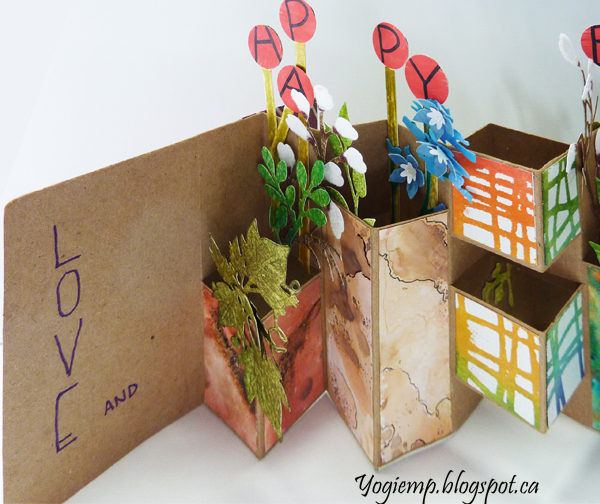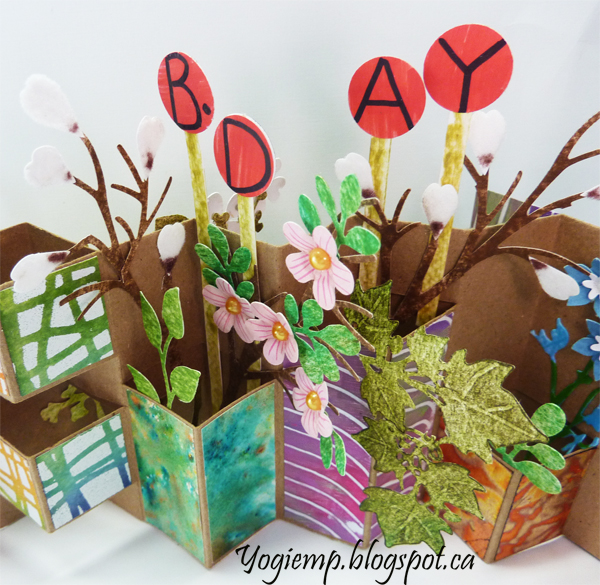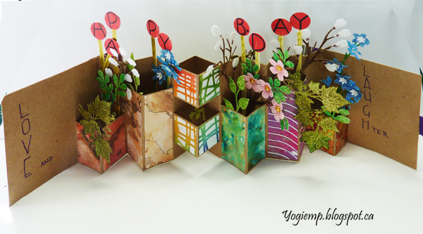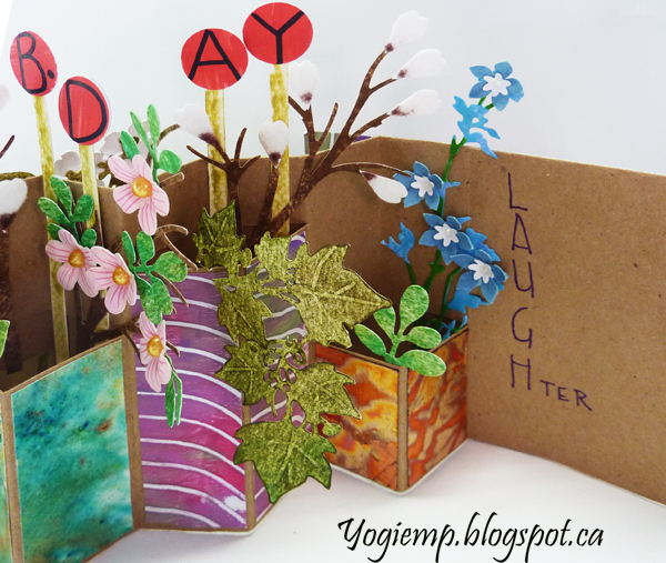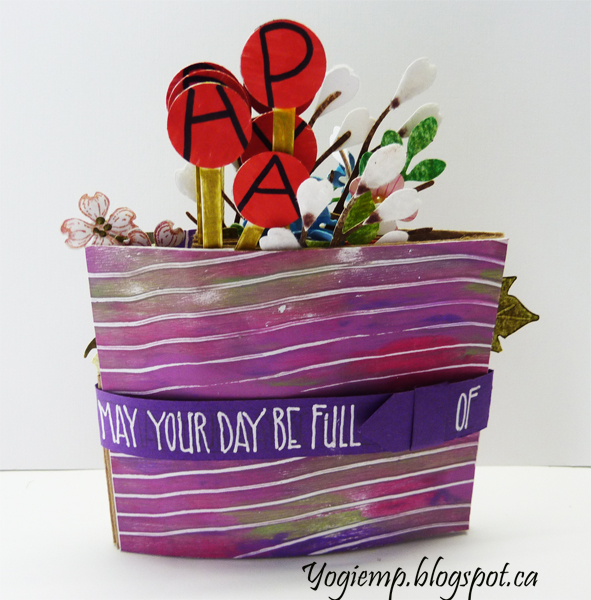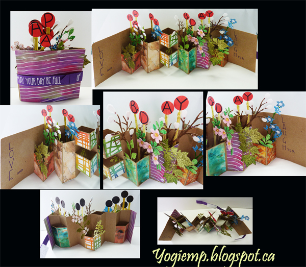I used Bogus Recycled Sketch Paper for the booklet using approx a 8" x 15" paper. Folded and slit off at various heights both in front and on back to create the various size vases. Decorated them and created the cover with decorated papers from my stash... I also raided my stash of die cuts, 3D flowers and cut a few more... Adding the lollipops to spell Happy B.Day. The white flowers are pussy willows covered with white and a touch of brown flocking. Added pearls to some flower centers. Wrote out the words on the front closure with white gel pen. ("may your day be full of") Wrote the words on the inside with a purple Zig Writer. |