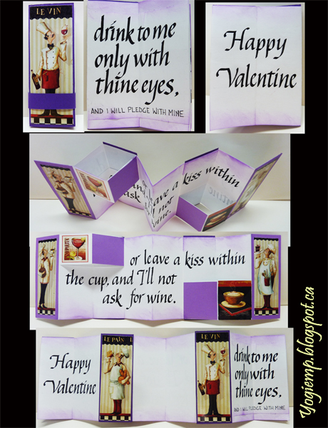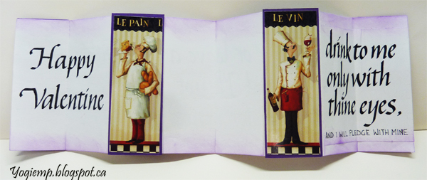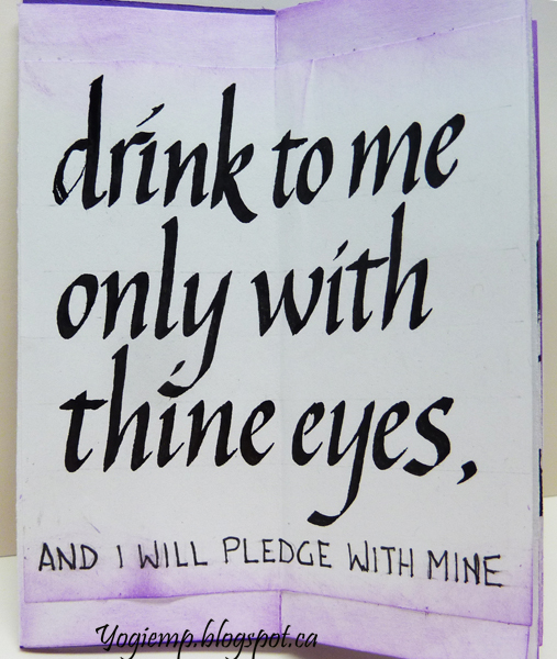 I used white calligraphy paper 8" x 12.5". Folded as normal, but put the covers onto the 3rd page and folding closed at different points to the basic fold. Open the cover to the 2 page "drink to me" quote. The same for the right edge opening to the "Happy Valentine", then grasp the right and left edge and open completely. I used a pad with photo images and adhered onto a purplish cardstock and then onto the structure. Sponged some purple Distress pad over the edges. Quote written with a 2.4 Parallel pen and Sumi ink. Quote: Drink to me only with thine eyes, and I will pledge with mine or leave a kiss within the cup, and I'll not ask for wine. |
