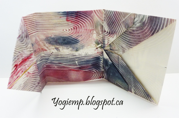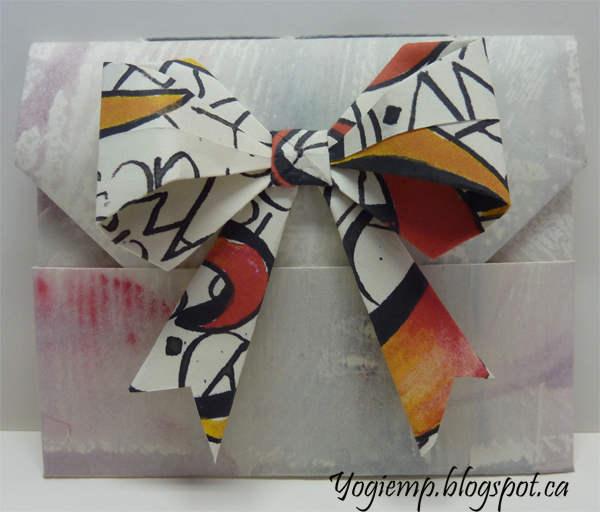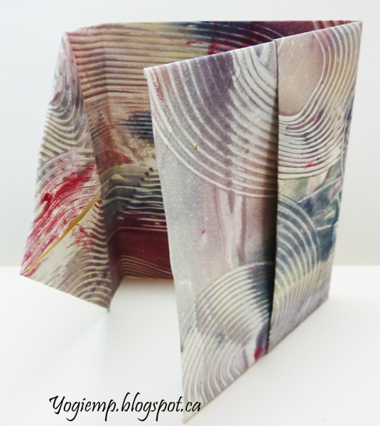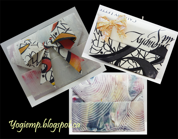 Created: December 3, 2022 Our Scribbled Lives challenge #48 is wrapping paper... I was honored to be on the cover of our latest Guild journal so photo copied it in color and B&W. I had wanted to put the colored bow onto the B&W print booklet but found it too busy, so created several... ROFL The booklet instructions is #23 in "Art Of The Fold" book by Heidi Kyle I'm using Columbia Mills LBS End Paper, which folds nicely, has a good weight and is sturdy. I created 2 geli prints using a yellow gouache, a red and dk blue acrylic paint. I liked the print but it was too dark for what I had in mind so pulled a 2nd generation print - YES!! Instructions for making the BOW HERE |