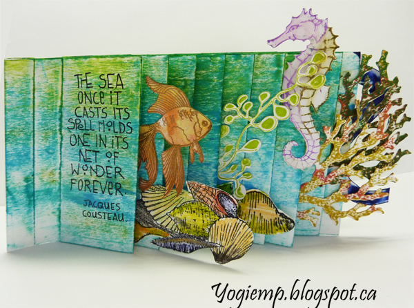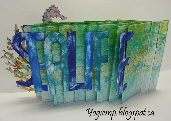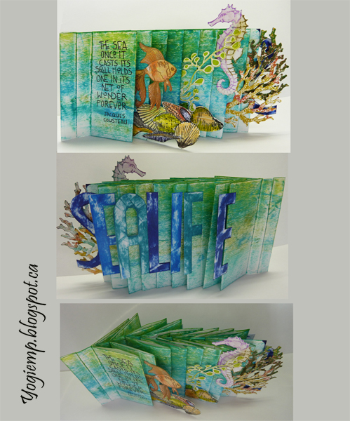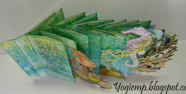 I started with a piece of basic text paper 8" x 34", splicing 2 papers together. Applied Distress pads direct to paper in several blues and greens. Created my structure in the basic way having all the folds the same size. Each page is approx 1.7"w I've made a collection of cut files from my favorite stamps, so had a lot in my stashes. Stamped them as needed. Adhered them to the edges of the pages. On the back side, I drew the letters on cardstock, cut out and colored with various Versa Clair blue pads and adhered them to the edges of the pages. Wrote my text with a Zig Writer Quote: The sea once it casts its spell holds one in its net of wonder forever. Jacques Cousteau |