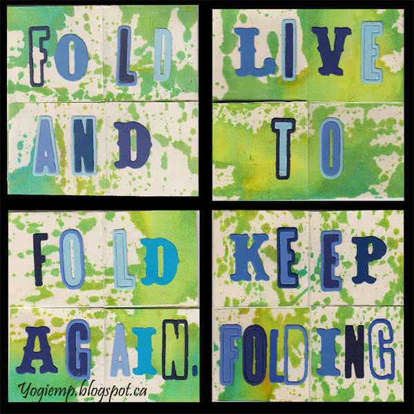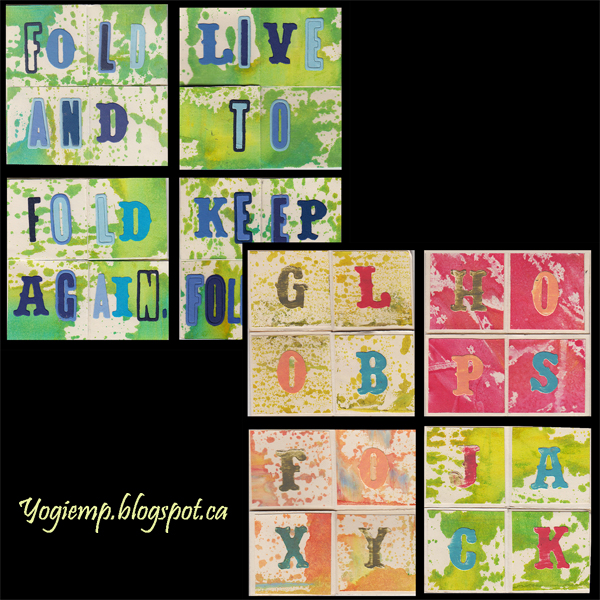 December 19, 2023 The challenge for our next Art Of The Fold Group had a couple options for our next meeting in January. Flexagons... you have to be careful how you turn/open the pages... I used some of my geli prints for both done on Columbia Mills End Paper. the letters die cut using Tim Holtz "Vintage Market" and "Inside Out" on various colors of cardstock. The multi colored one says Glob Hops Foxy Jack. I did this one first and didn't really know what to put on it... Hence the crazy words... The green one says "Live to fold and fold again. Keep folding.