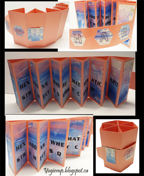 I used Canson Colorline (pink) which I don't like because it tears so easily... but I really want to use it all up... Cut my paper 4.5" h x 21" (approx). Scored and folded every 2". The under strip that the structure is glued to is 21" total length (10.75"is the narrower section for the wrap around.) I used one of my geli prints. Found a typeface I liked and printed the quote text on copy paper in the size I wanted, cut them out, colored them black and glue to my structure. quote: hexagons where mathematical artistry meets quirky charm. Punched out hexagons from the geli print paper and wrote the letters for the title.