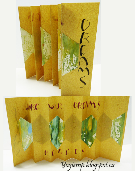 March 8, 2024 size: 2"w x 6"h The challenge for our next Art Of The Fold Group had us making Interlocking Accordions... I decided to use beige Elephant Hide paper for the main structure and one of my gelli prints for the interlocking page. Used a Kuretaki black 3.0 calligraphy pen for the cover and a 3.0 Parallel pen with D'Atramentis Pearlescent ink "Magenta Red - Gold" for the inside text. It bled a touch on the 1st letter...and you can't see the gold sheen on the letters... c'est la vie... Words: Make