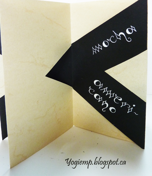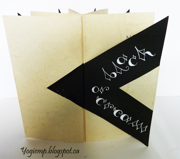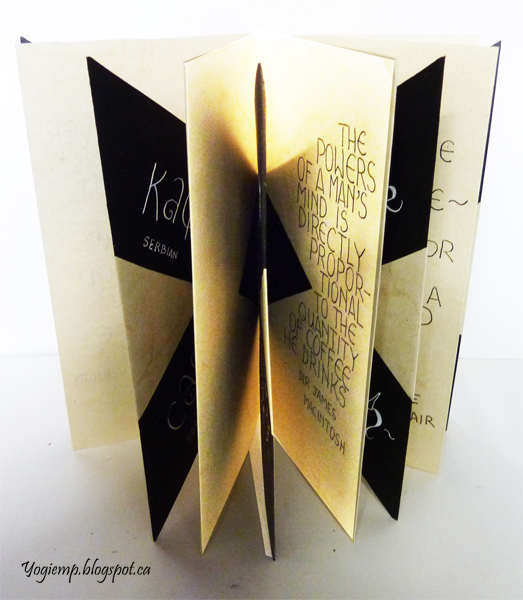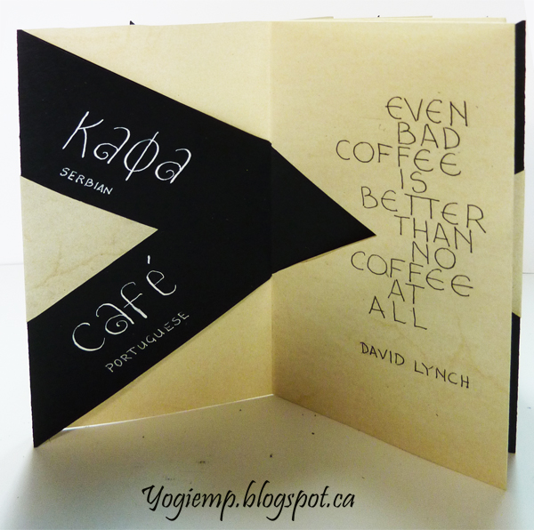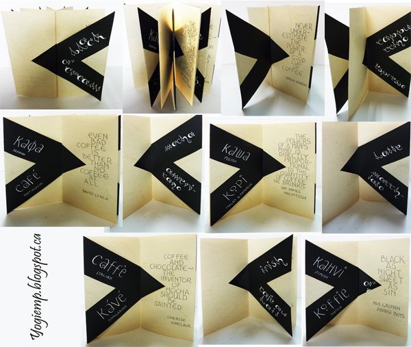 October 21, 2023 Our next challenge for our Art Of The Fold Group was to create this interlocking accordion booklet. I made mine a little bigger. I used the light weight Elephant Hide Paper in black and cream for the accordions.(24" of each color). I re-purposed the little triangle cut outs from the cream paper as a decorative element on the black paper. The funky lettering for the title and coffee names is from Tadelus Wastowicz Type Design. The different languages for coffee names is done in monoline. Both using pointed pen and Bleed Proof white ink. The quotes are a basic monoline with a Juice Up pen instructions can be seen HERE |