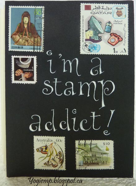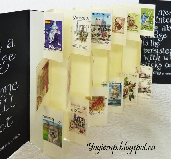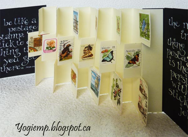 Created: March 20, 2021 I'm an addict when it comes to postage stamps... I usually buy the newest Canadian stamps when they are issued including the souvenir sheets... I will never use them all in my life time... but I love having the choices when I'm designing an envelope or something. The only stamps I stay away from are SPORTS. ugh. This binder holds hundreds and hundreds of usable stamps. I'm using Columbia Mills LBS End Paper, which folds nicely, has a good weight and is sturdy. My folds are 2" making it a 1" loop flap. I used an unknown black cardstock for the covers. My text and quotes are written with a Nikko G nib and Holbien "Permanent White" gouache. On the cover: I am an addict Inside left side: Be like a postage stamp, stick to one thing till you get there. Josh Billings Inside Right Side: The most interesting thing about a postage stamp is the persistence with which it sticks to the job. Napoleon Hill |
